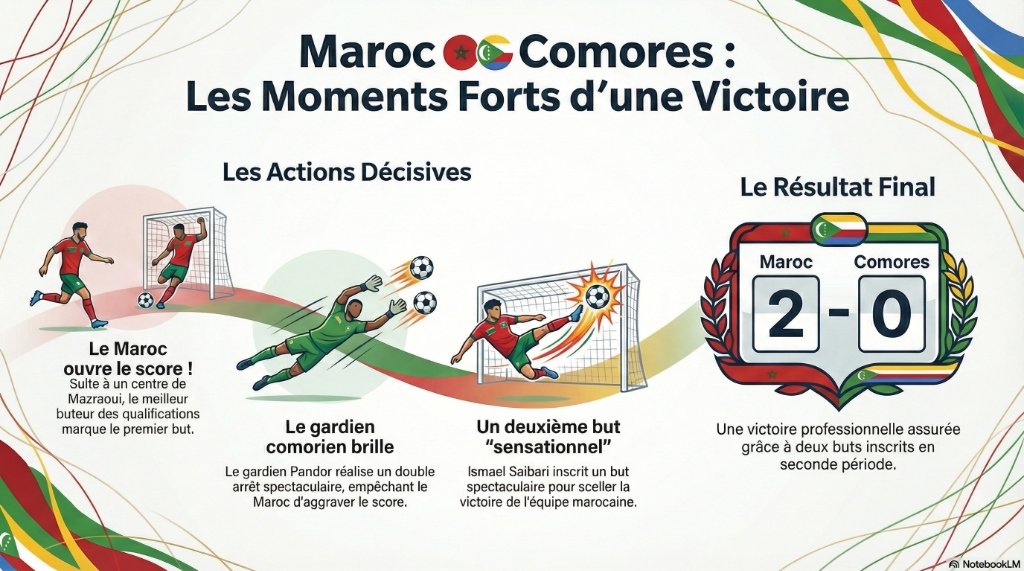 Le Maroc réussit son entrée en lice ! Dans un match piège par excellence, les Lions de l'Atlas ont assuré l'essentiel en s'imposant 2-0 face à une équipe des Comores héroïque. Si le score semble confortable, le scénario du match a longtemps laissé planer le doute au-dessus du Stade Prince Moulay Abdellah.